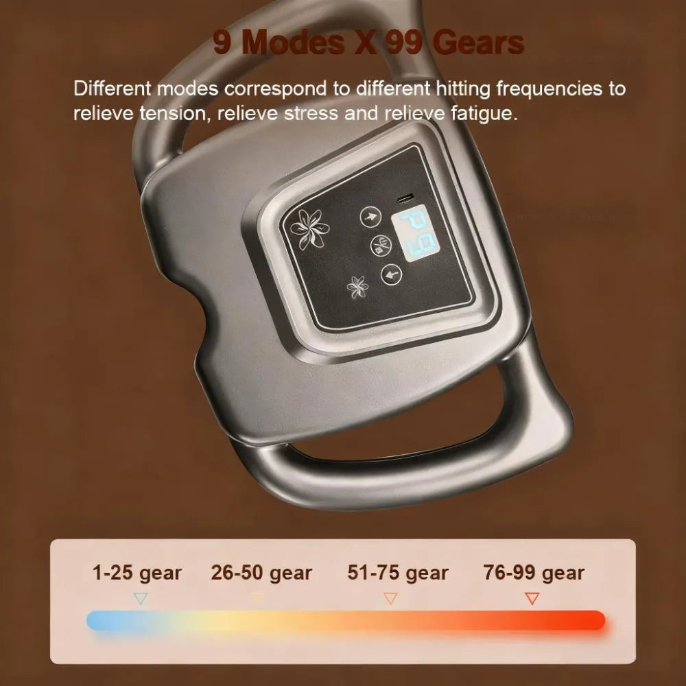 9 Modes & 99 Intensity Levels: Offers variable percussion frequencies across different modes, alternating between high and low speeds to relieve tension and reduce fatigue. Suitable for solo use on thighs, calves, arms, waist, back, neck, shoulders, and glutes—or enhanced when used with a partner.